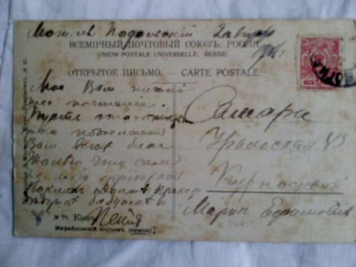 Полно людей. Хоть зимою, но почему-то всё зелёное :) Немного заломан верхний левый угол. Письмо кому-то. Два штампа на передней стороне (Самарские - дата 12.8.17) и один сзади на марке. Открытки Д. Маркова, Киев, Крещатик № 41. |